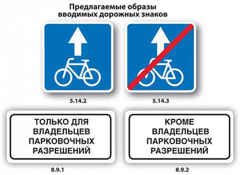 Также теперь появился новый знак 5.14.2 «Полоса для велосипедистов». «Это связано с тем, что некорректно применяемый в настоящее время знак 4.4.1 «Велосипедная дорожка или полоса для велосипедистов» служит для обозначения одновременно велосипедной дорожки и полосы для велосипедистов, несмотря на то, что они имеют различный режим движения».